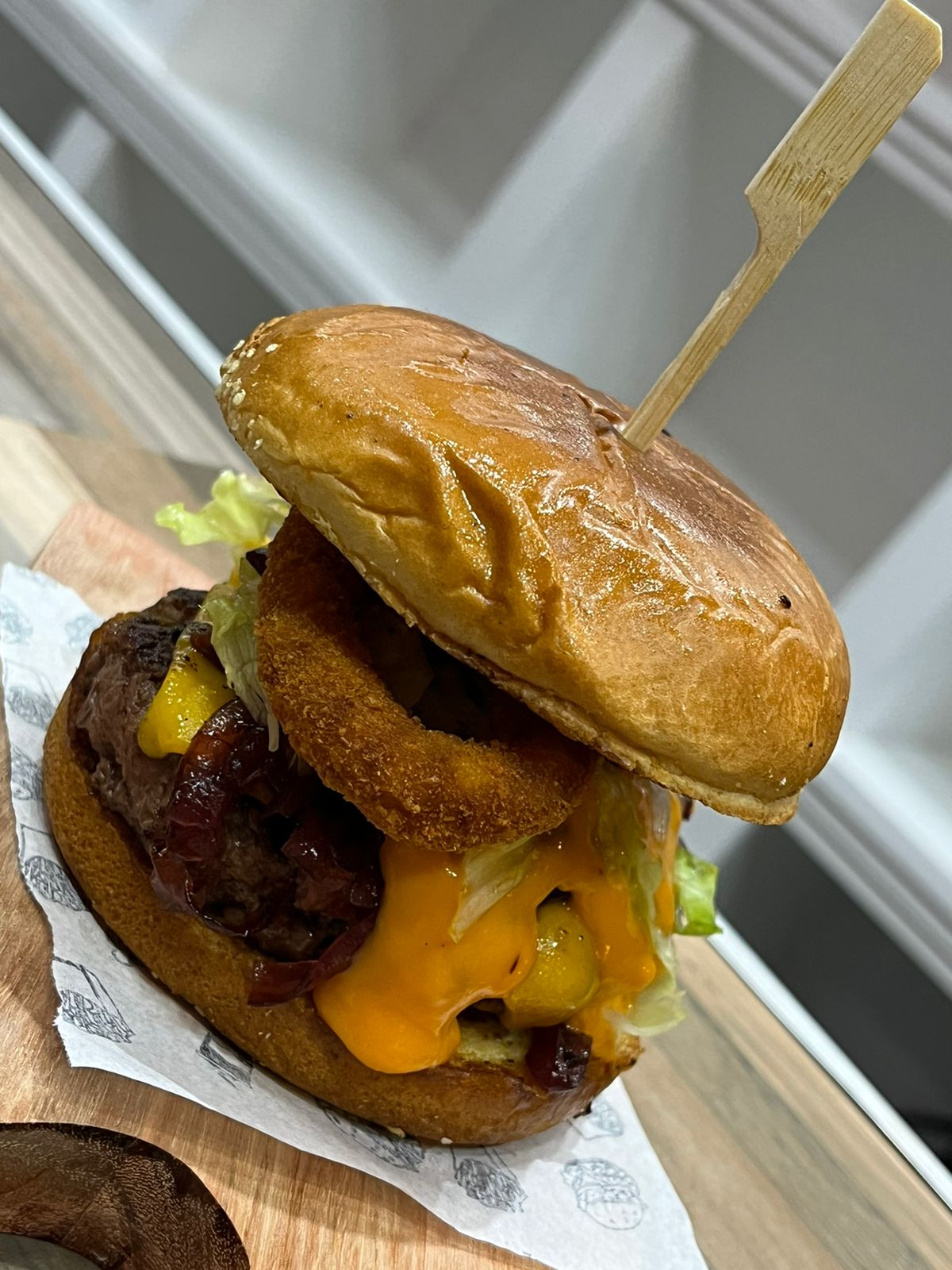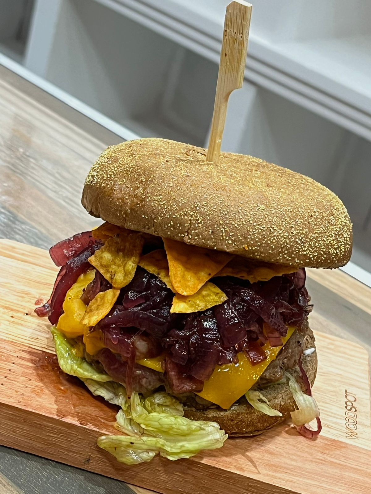 Pão australiano, blend de carnes 150g, doritos, queijo, cebola caramelizada e bacon