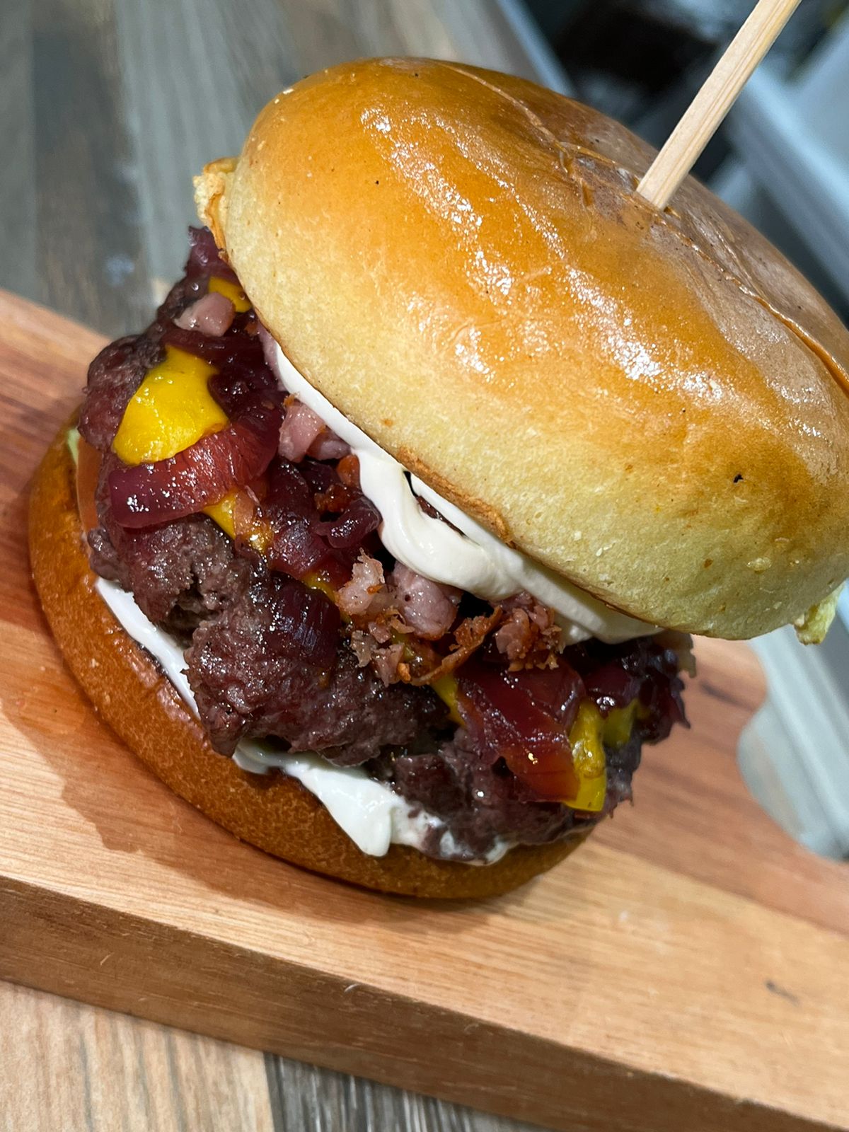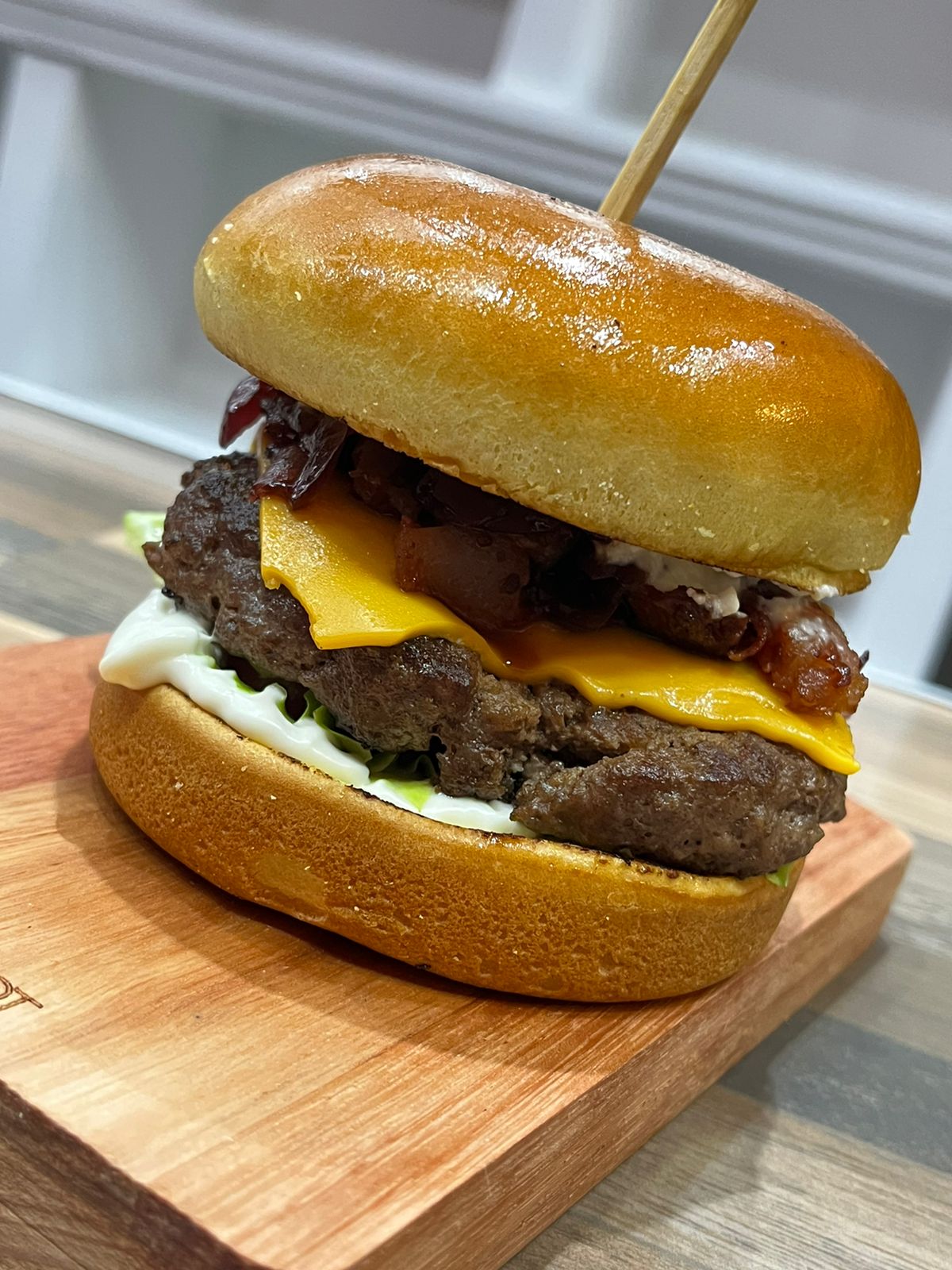 Pão Brioche, 150g de cupim na cachaça, queijo, cebola caramelizada, cream cheese, alface tomate
