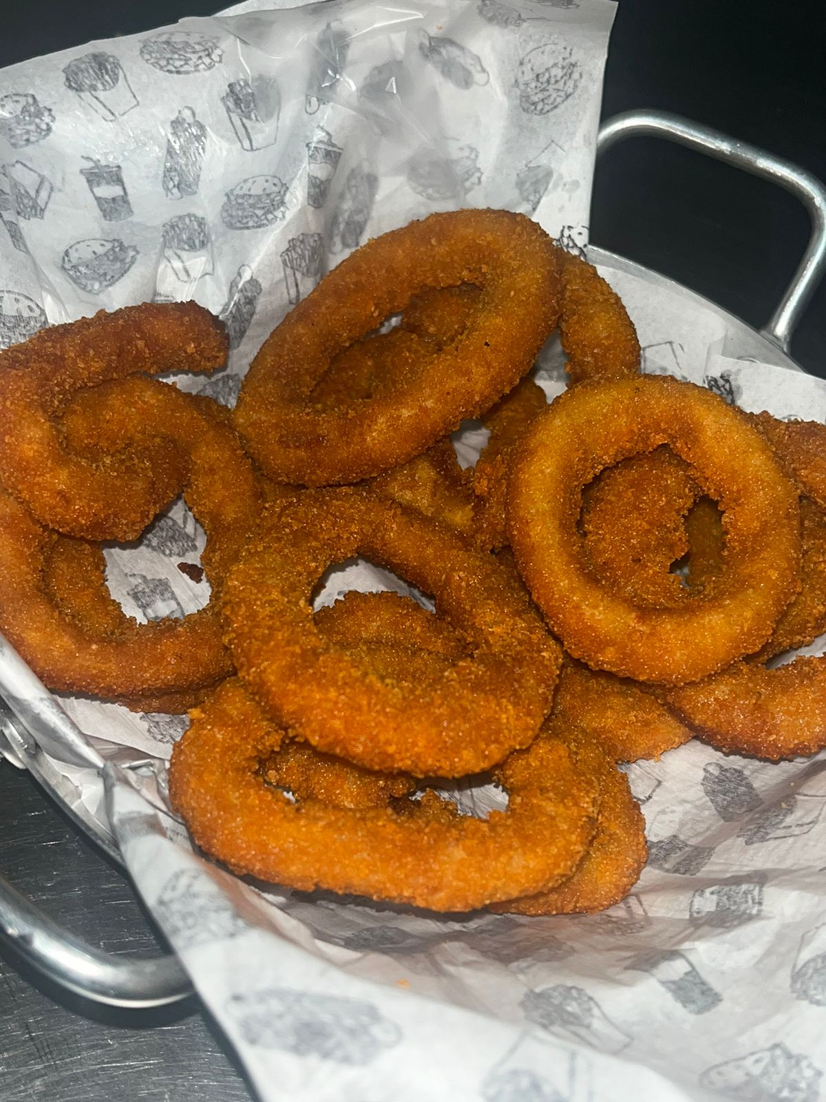 Pão tradicional, blend de carbes 150g, cream cheese, queijo, cheddar, alface, tomate, cebola caramelizada e onion rings
