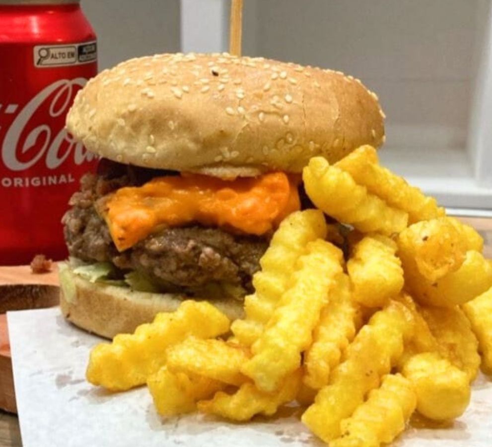 Pão australiano, blend de carnes 150g, doritos, queijo, cebola caramelizada e bacon + batata + refrigerante